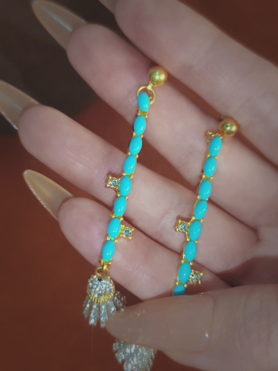A luminous play of movement and color, the Azure Cascade Drops flow in an elegant vertical line of enamel-detailed turquoise tones, finished with a crystal-fringed flourish that catches the light with every turn. Poetic yet striking, they frame the face with effortless sophistication—ideal for both day and evening allure.