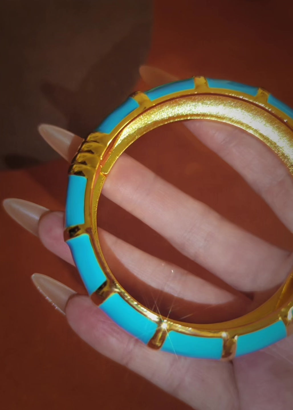 Glossy enamel panels in a vivid azure tone are set within radiant gold, forming a bold and sculptural silhouette. Effortless to wear with its hinged design, it brings a polished elegance to both day and evening resort looks.