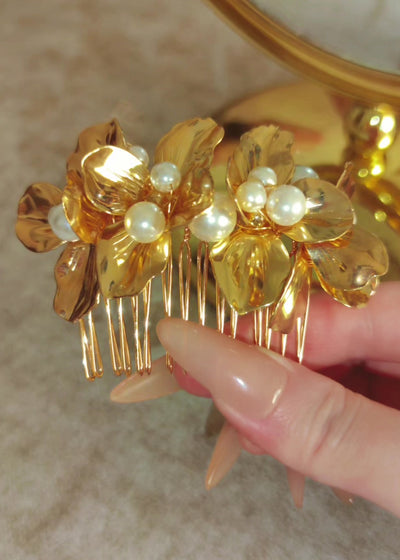 A sculptural comb composed of high-shine petals and soft pearl accents, arranged in a natural arc that curves elegantly across the hair. The gleaming gold finish catches the light with every movement, creating a luminous, blooming silhouette. A striking piece for soft updos, resort weddings, or sunlit celebrations.
