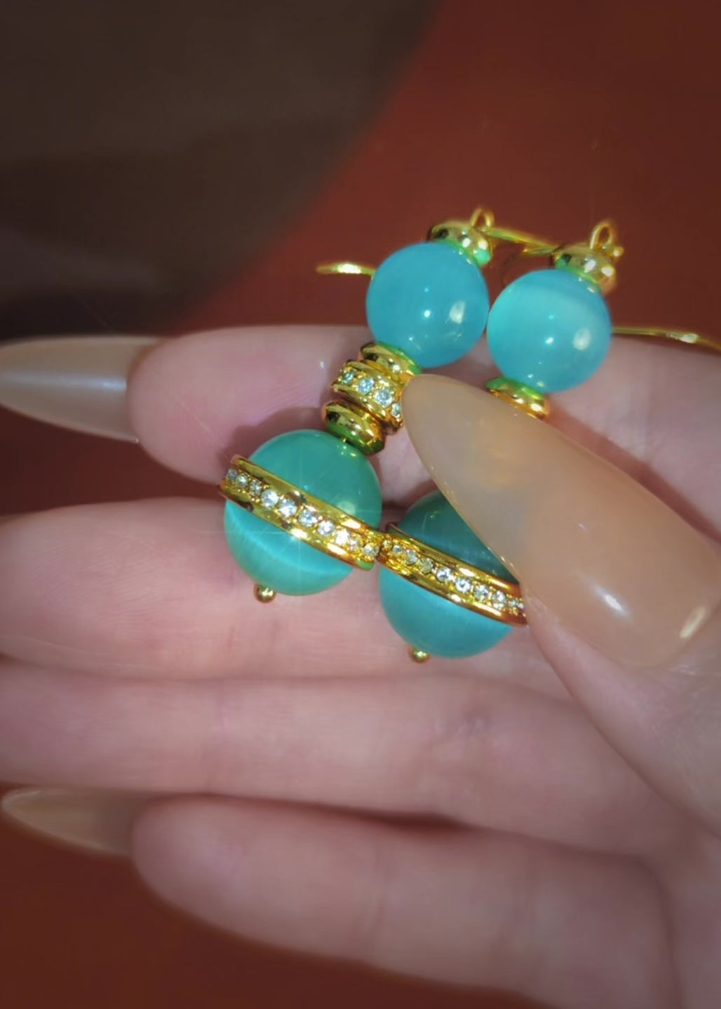 Glossy cat-eye stones in soft blue are stacked with gold and zirconia accents, creating a luminous drop that balances elegance with ease. Designed to echo the necklace and bracelet, these earrings complete the set with refined harmony.