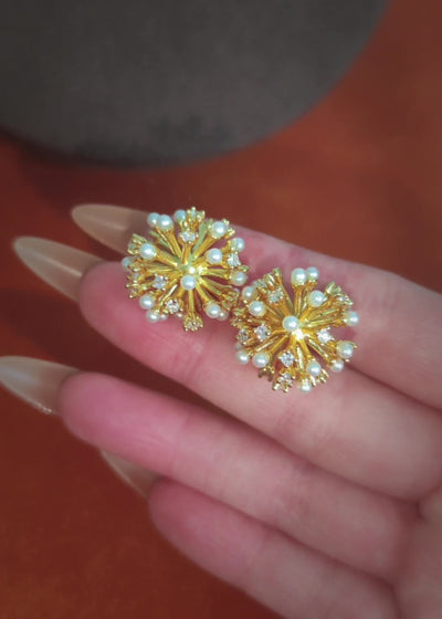 A sculptural ode to radiance — each spoke fans outward like a celestial bloom, crowned with luminous pearls and crystalline light. The rounded silhouette floats with quiet drama, bold yet ethereal. A piece that feels unearthed from a dream, made modern for the now.