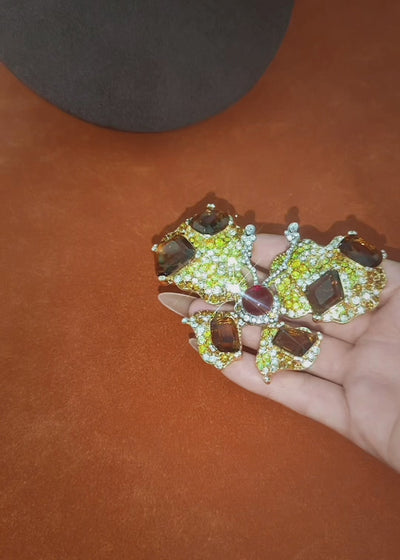 A sculptural butterfly brooch ablaze with golden brilliance and faceted amber-like stones. Its wings unfold in a flourish of pavé-set detail, centered by a deep crimson cabochon that draws the eye with regal intensity. Rich in texture and movement, this piece evokes old-world glamour through a modern, editorial lens—striking on silk, eveningwear, or structured tailoring.