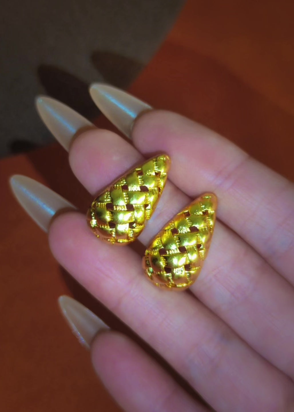 Teardrop earrings with an intricate woven texture, glowing with sculptural depth. Their elegant curve and dimensional design evoke timeless glamour—perfect for seaside dinners, grand resorts, or evenings abroad.