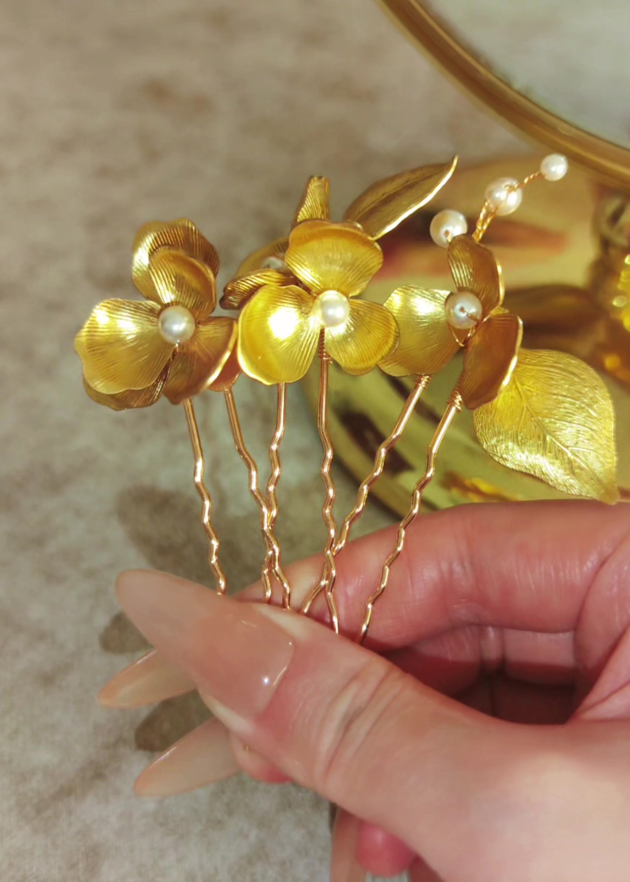 A refined set of three sculptural pins, cast in brass for a weightier, more polished finish. The petal-like forms trail gracefully through the hair, catching light with subtle radiance. Designed to elevate everything from soft waves to sleek chignons, this trio brings a quiet sense of luxury to any spring or resort look.