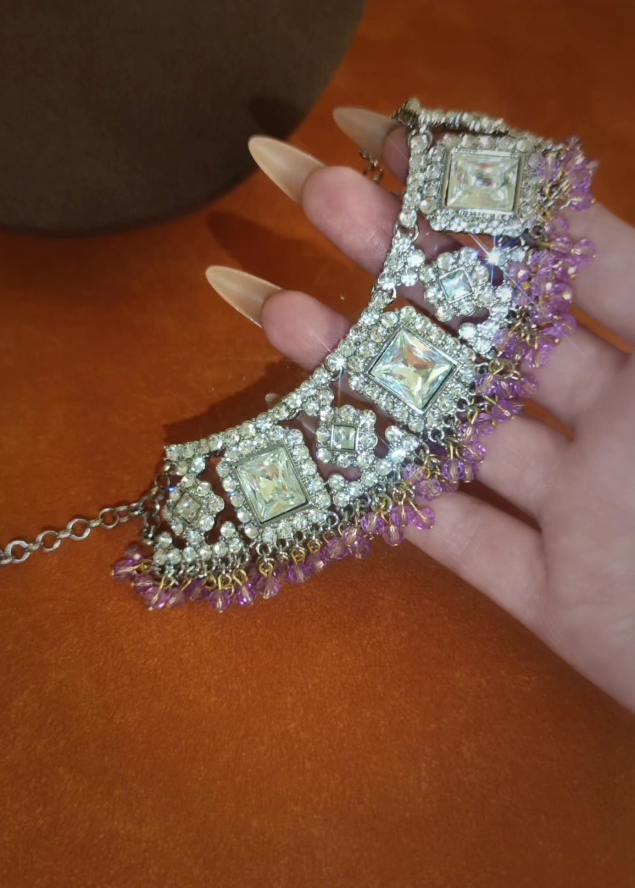 A final flourish from the Jardin Bloom collection — this statement bracelet mirrors the collar’s sculptural geometry in a refined, wrist-length form. Cascading lilac beads and pavé-set motifs create a soft, luminous rhythm across the hand. Adjustable for a perfect fit; radiant on its own or styled with the full set.