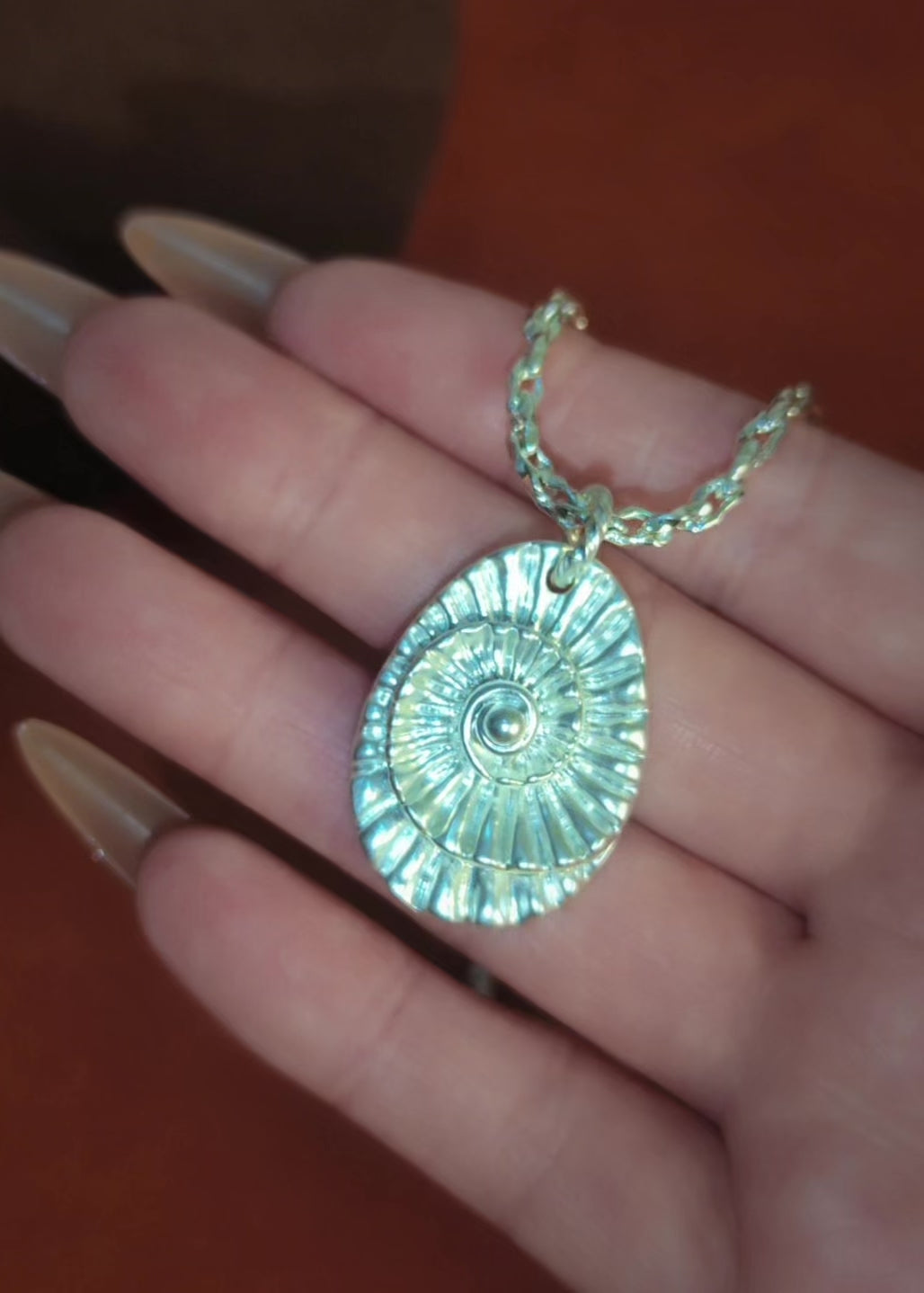 An oval pendant inspired by ancient sea fossils, etched in a sunlit spiral relief. Its textured form recalls treasures found along island shores—timeless, sculptural, and imbued with a quiet elegance. Perfect for layering on seaside holidays or wearing alone with a linen dress at sunset.