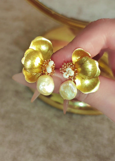 The statement piece of the Pearl Bloom series. Sculpted petals with a brushed gold-dipped finish cradle a cluster of seed-like beads, anchored by a luminous pearl drop. Elegant yet striking, this pair brings fluid movement and refined drama to resort evenings or bridal moments.