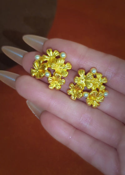 A romantic ode to lush gardens and golden hour light, these earrings bloom with layered florals in radiant relief. Scattered with soft pearls like morning dew, the textured petals evoke vintage heirlooms reimagined for sun-drenched escapes. Ornate yet effortless, they bring a touch of resort glamour to any destination look.