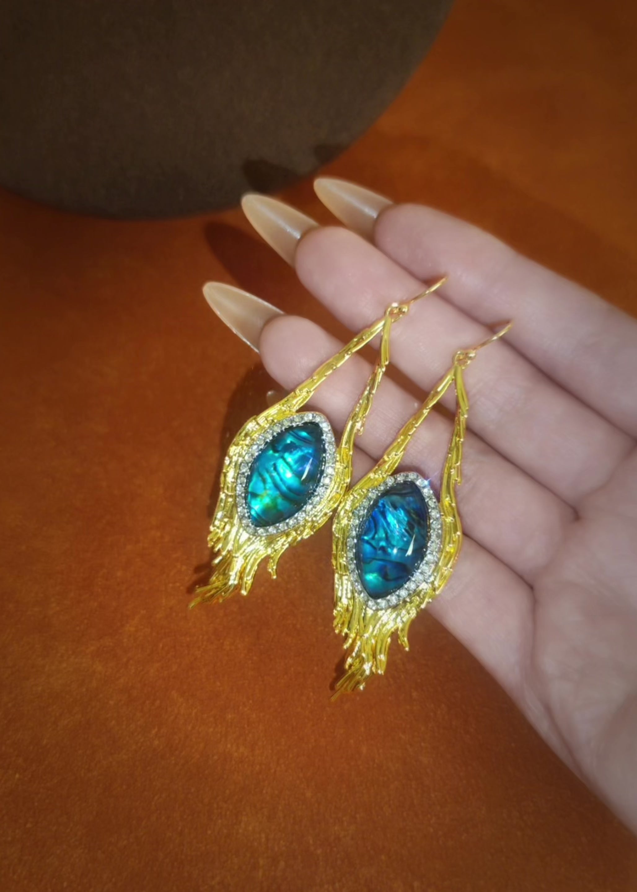 A sculptural silhouette that recalls the drift of a feather and the shimmer of a desert mirage. These hook dangles captivate with a radiant gold finish and a mesmerizing blue stone that glows like a hidden oasis at dusk. Designed for sultry evenings, wind-kissed silhouettes, and luxurious escapes.