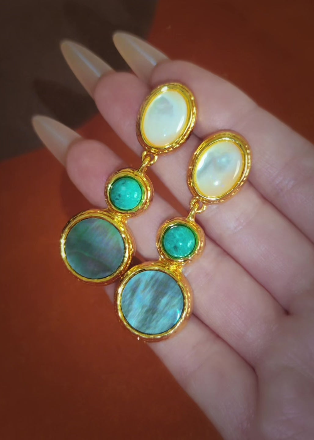 Echoing the glow of desert skies and coastal horizons, these double-tiered earrings blend smooth curves with luminous contrast. A soft, moonlit stone anchors the base, while the top glows with a vivid turquoise pop — an ode to sun-kissed escapes and mystical terrains. Lightweight yet striking, they capture the spirit of endless summer and faraway reverie.