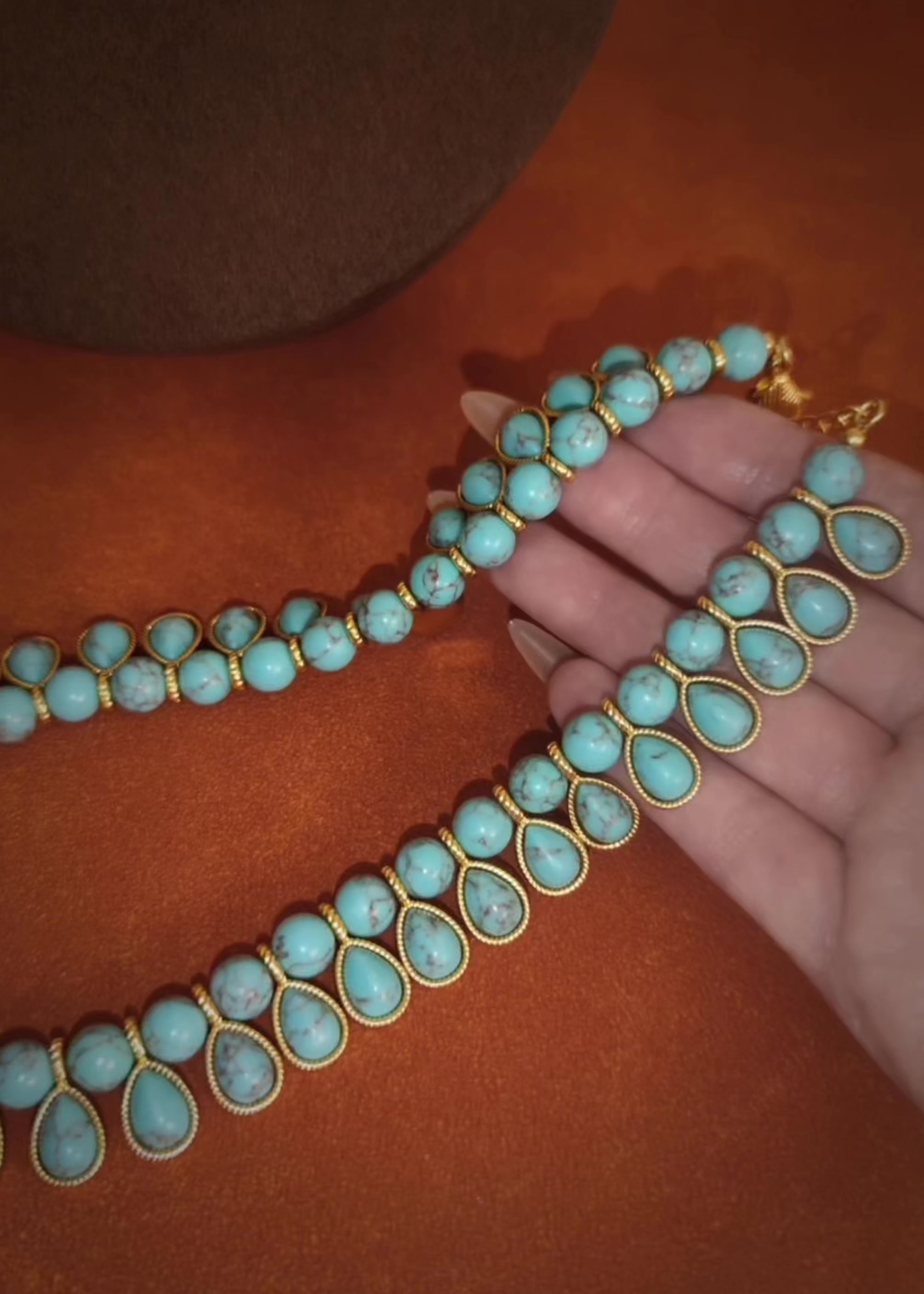 A cascade of rounded and teardrop turquoise stones radiates from the neckline with sculptural rhythm and vintage elegance. The layered silhouette and organic veining create a bold yet composed presence—designed to elevate with quiet confidence.